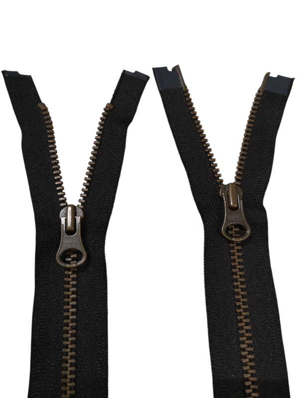 Robust YKK 6mm metallblixtlås i antikguld. 2-vägs delbar funktion för jackor & väskor.